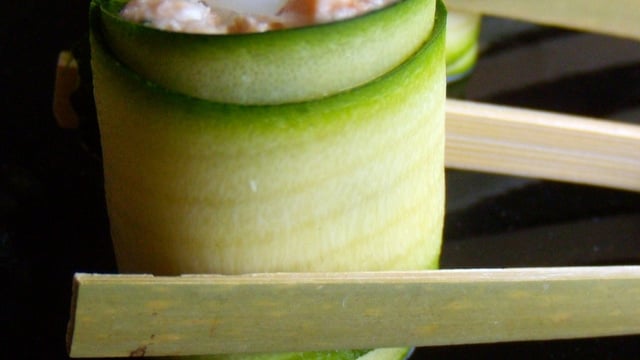 On peut aussi tout simplement se servir des lamelles fines de courgettes, comme d'une feuille de nori. De cette manière on tartine la courgette de rillettes, on dépose une petite quenelle de riz puis on enroule la courgette sur elle même. On obtient ainsi, une petite bouchée bien sympathique.