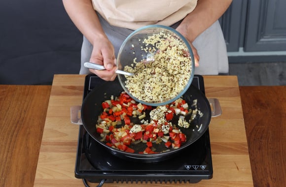 7Ajoutez le mélange de Couscous, Quinoa et Graines de Lin cuit, laissez revenir 5 minutes à feu moyen, en remuant souvent. Puis ajoutez le fromage râpé. Rectifiez l'assaisonnement.