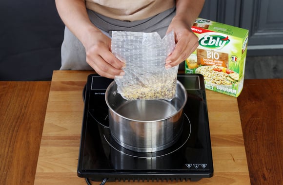4Faites cuire le sachet de Couscous, Quinoa et Graines de Lin selon le mode d'emploi. Egouttez et réservez.