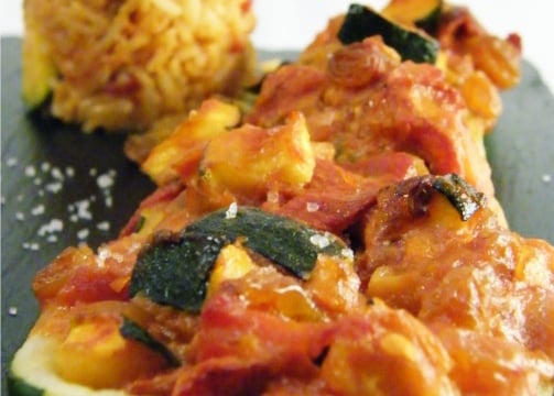 Farcissez les des légumes et enfournez le tout 20 minutes à 180°C. Le dessus aura compoté un peu plus et la courgette en dessous sera craquante.