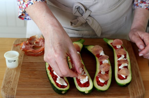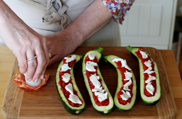6Ajoutez un peu de fleur de sel dans le creux des courgettes. Remplissez chaque demi courgette avec la sauce tomate