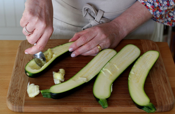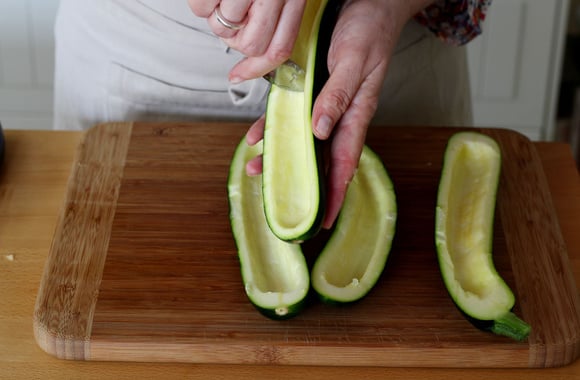 3Creusez l'intérieur des courgettes à l'aide d'une petite cuillère (ou une cuillère parisienne si vous avez). Gardez la pulpe pour une autre recette.