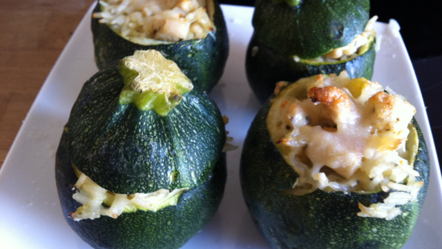 Servir dans chaque assiette 2 courgettes rondes, en remettant les chapeaux (le parmesan ayant gratiné)