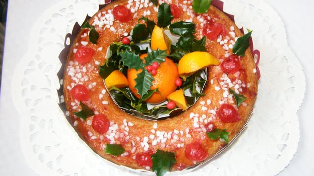 Laisser refroidir .A l'aide d'un pinceau badigeonner la surface de confiture. Décorer le dessus de cerises confites, de mandarines et parsemer de sucre en grains.