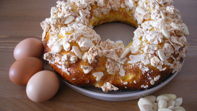 Une brioche des rois à la vanille, alliée avec le croquant de meringue aux amandes...