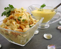 Voici une entrée originale et rafraîchissante à base de chou-fleur cru, d'oignons, de raisins secs et de pignons de pin, le tout accompagné d'une sauce au curcuma et au persil.