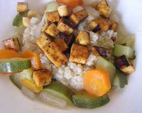 - Servir le quinoa dans un plat et mettre par dessus les légumes et le tofu, et saupoudrer d'un peu de coriandre