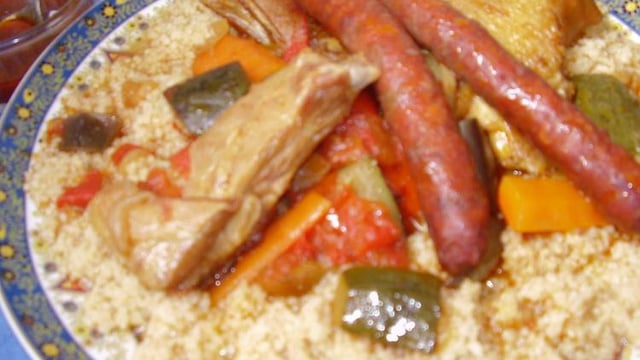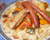Traditionnellement, le couscous se prépare avec un seul type de viande, car le bouillon et la semoule qui cuit à sa vapeur s"imprègnent de son arôme. On peut ainsi déguster des couscous au mouton, au poisson, au poulet... Cependant, il n"est pas rare de trouver, notamment dans les restaurants, des couscous où viandes rouges, blanches et merguez se mélangent. Le couscous royal comporte généralement plusieurs viandes : poulet, merguez, mouton, boulettes....