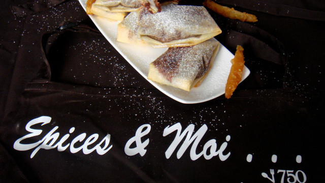 Couper les feuilles de brick en deux, rabattre la partie arrondie sur le côté coupé pour obtenir 16 rectangles.