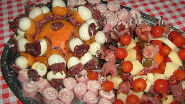 Pour les roulades de jambon de Paris, étalez sur chaque tranche du fromage ails et fines herbes, roulez la tranche en petit boudin, roulez ce boudin dans du film alimentaire, bien serrer et ficelez les deux extrémités, mettre au frais quelques heures afin de faciliter la découpe en rondelles mais de toutes façon et à condition que cette fois, la photo s'affiche bien, se référer à la photo, cette préparation est éclatante, haute en couleurs, les invités étaient tellement impatients de déguster que j'ai fait ma photo en cours de dégustation.