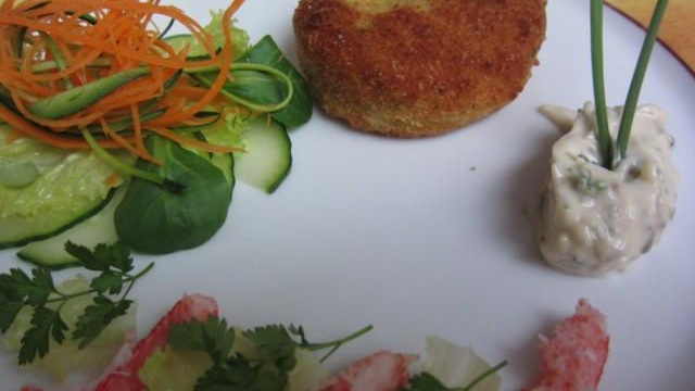 Petit beignet a base de purée et de crabe recouvert d'une chapelure.