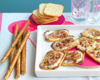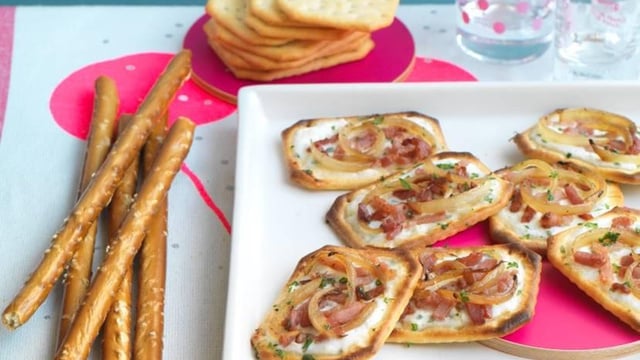 Tartinez vos crackers de ce mélange et recouvrez de lardons et d'oignons.