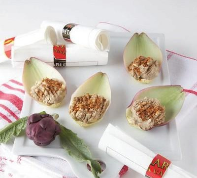 Au moment de servir, dans chacune des feuilles d'artichauts sélectionnées, placez une petite cuillère de votre mélange et poudrez délicatement de paprika.