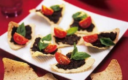 Ajoutez une demie tomate cerise et une feuille de basilic.