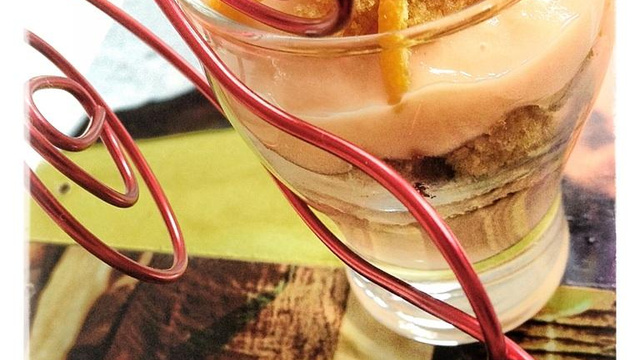 Remplissez vos verrines à moitié, y mettre le pain d'épices, et recouvrez de nouveau avec la crème. Décorez avec des miettes de pain d'épices et de la peau d'orange en fines lamelles.