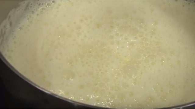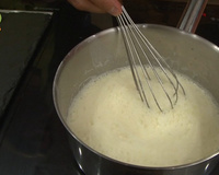 Quand le lait est à petite ébullition, versez-le sur le mélange sucre-oeufs, sans cesser de remuer.