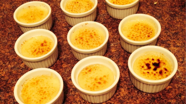 Remplir les plats à crèmes brûlées avec ce mélange sur une hauteur de1,5 cm puis enfourner pour environ 50 minutes à 12°C jusqu'à ce que les crèmes soient prises mais encore légèrement tremblotante au centre.