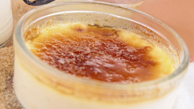 Après refroidissement, mettre au frais et au moment de servir, couvrir de sucre roux et passer le chalumeau de cuisine pour faire dorer les crèmes brulées.