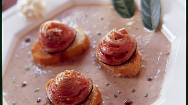 Dans 4 assiettes creuses, versez la crème de lentilles et disposez 4 croûtons d'andouille.