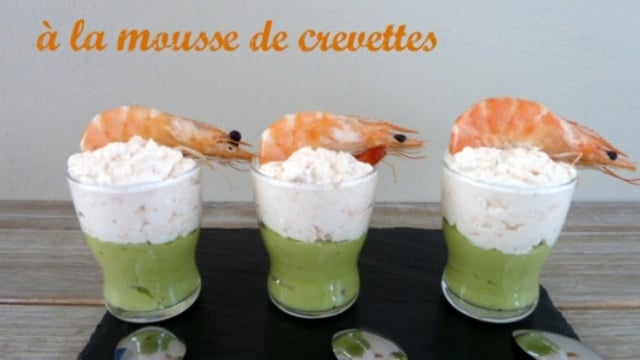 Une délicieuse verrine d'avocat surmontée d'une mousse à la crevette légère et aérienne comme un nuage. Une entrée fraîche et esthétique!