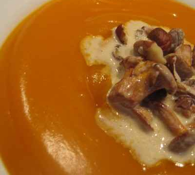 Dresser la crème de butternut dans les assiettes, creuser un petit cratère au centre et y déposer les girolles.