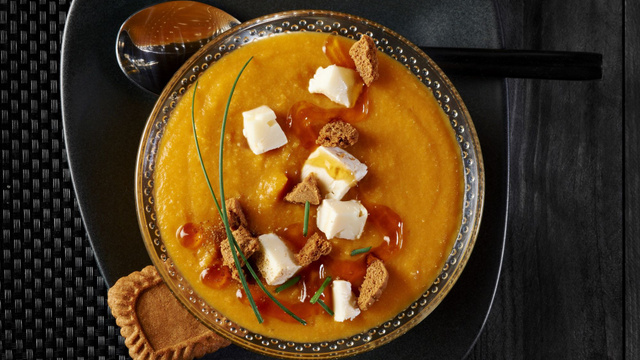 Ajouter un trait d’huile d’olive, de miel et le spéculos en brisures. Décorer de ciboulettes en brins.