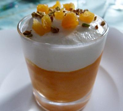 Déposez votre mousse de chèvre au dessus du velouté de carottes dans vos verrines. Laissez reposer au moins 6 heures au frigo. Avant de servir, parsemez de dés d'abricots secs et de pistaches concassées.