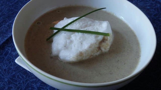 Une petite crème de champignons surmontée d'oeufs en neige et parfumée à la coriandre... un délice spectaculaire