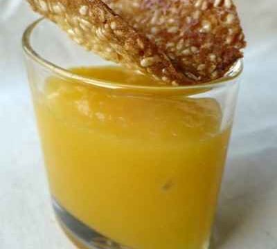 Compote de mangue pour le côté onctueux et petite tuile pour le côté croustillant