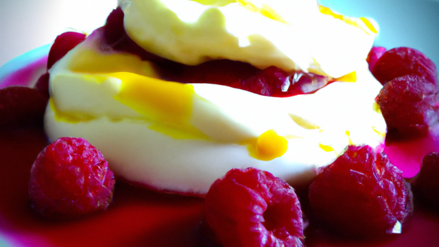 Verser quelques cuillères à café sur la crème et garnir de quelques framboises entières restantes.