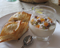 Verser dans les verrines, laisser refroidir au frais et avant de servir saupoudrer, de cannelle, noix de coco, pistaches, raisins et abricots en petits cubes.