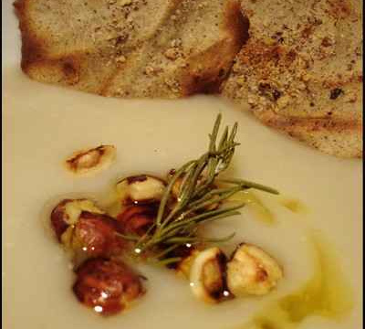 Au moment de servir, concasser les noisettes et les faire griller à sec dans une poêle, verser la soupe chaude dans le fond des assiettes, ajouter un trait d'huile de noisette, les noisettes concassées et servir avec les tuiles de sarrasin.