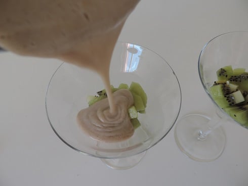 2Dans chacune des 2 verrines, placer les dés du kiwi, préalablement épluché. Verser la crème sur les dés de kiwis, filmer, laisser refroidir et placer au frigo jusqu'au moment de servir.
