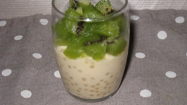 Avant de servir, peler les kiwis et les découper en petits dés et les répartir sur les crèmes.