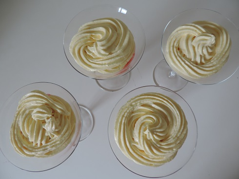 NB: Lorsqu'il faut séparer les blancs des jaunes pour battre les blancs en neige, je commence toujours par cette opération et puis je passe aux jaunes. Cela m'évite de devoir laver mes fouets! J'ai placé la crème dans une poche à douille afin que ma crème se répartisse uniformément (ou presque) dans les verrines. C'est toujours un dessert qui impressionne surtout par sa déco!