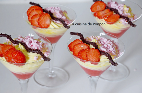 4Réserver au frigo jusqu'au moment de servir. Garnir chaque verrine d'une fraise coupée en fines tranches, de quelques brisures de meringues fraises et d'un sarment du médoc.