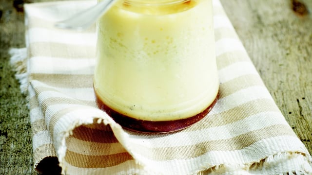 Bien remuer au fouet, puis verser la préparation encore chaude dans les verrines, sur le caramel.