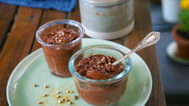 Voilà un dessert léger et original, grâce au mariage entre le chocolat et la coriandre. Facile et rapide à préparer, ces crèmes au chocolat et à la coriandre sont sans oeufs ni lait de vache.