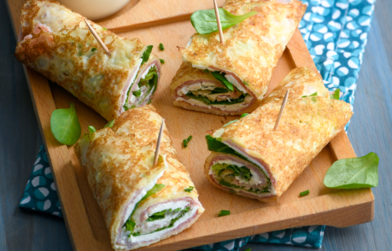 Roulez chaque crêpe sur elle-même, en la maintenant bien serrée avec une pique en bois. Coupez-les en 2 et servez avec le reste de mâche.