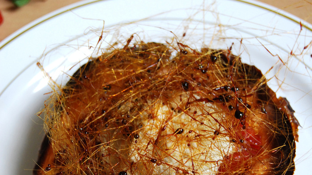 Garnir la crêpe chaude d'un lit de fraises poêlées aux noix de pécan (qui ont été maintenues chaudes). Déposer une boule de crème glacée au roquefort Papillon au centre, sur les fraises. Décorer avec du caramel (ici en cheveux d'ange).