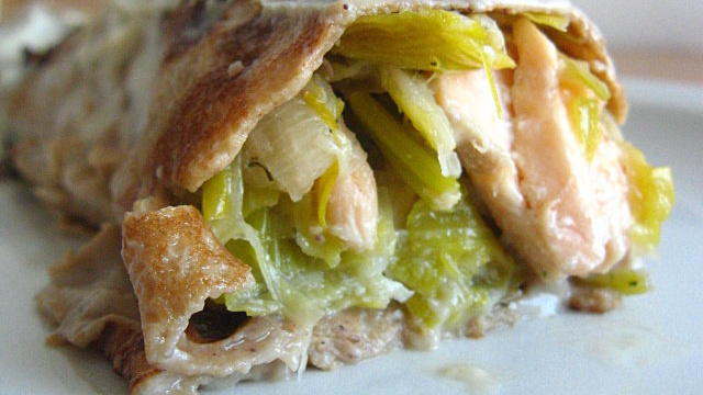 Garnir ensuite les crêpes avec la préparation saumon-poireaux. Les rouler, les placer dans un plat à gratin et les napper de béchamel. - 6