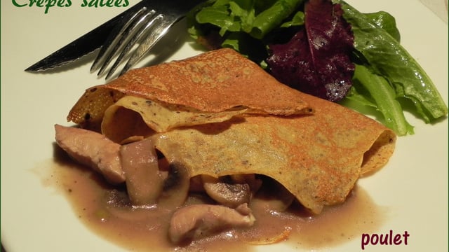 Une délicieuse crêpe sans gluten agrémentée d'une garniture de poulet et de champignons dans une sauce au vin.