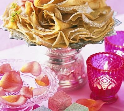 Note : Pour accentuer le parfum de rose, vous pouvez saupoudrer les crêpes de sucre à la rose. Pour ce faire, mettre, quelques jours à l'avance, des boutons de rose séchés (en vente dans les épiceries fines) dans un bocal de sucre en poudre.