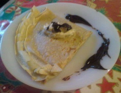 Déposer une boule du mélange sur les crêpes et un peu de chocolat fondu (ou confiture,...)