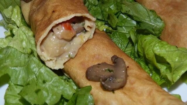 Mettre de la farce sur chaque crêpe, les enrouler ou les plier en portefeuille. Les placer dans un plat allant au four, recouvrir d'aluminium et faire chauffer 10 à 15 min à four préchauffé à 210°C. Servir aussitôt avec une salade verte.