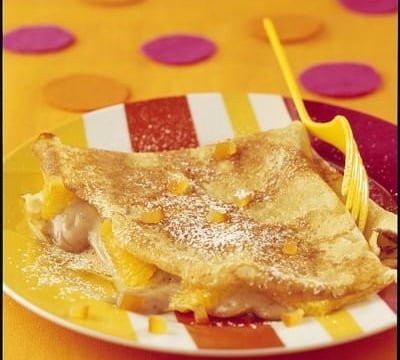 minute 30 environ à puissance moyenne. Etaler le quart de la crème de marrons sur chaque crêpe, puis répartir les quartiers d'oranges par-dessus et replier en forme d'éventail. Disposer chaque crêpe sur une assiette individuelle, la saupoudrer d'un peu de sucre glace et la décorer avec des petits dés d'orange confite. Servir aussitôt. - 3