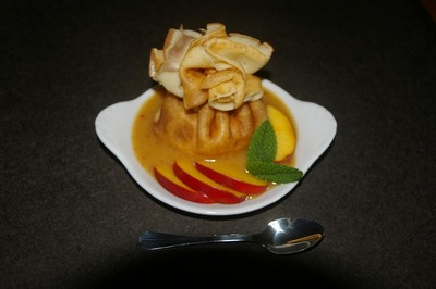 Crêpes accompagnées de glace vanille et de coulis de pêches et de nectarines