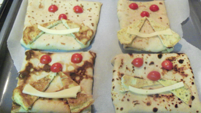 Plier les crêpes par les quatre bord et les retourner, les mettre sur un plat allant au four et procéder à la décoration : les oeufs pour la moustache, le gruyère pour la bouche et les tomates cerises coupées en deux pour les yeux et le nez.