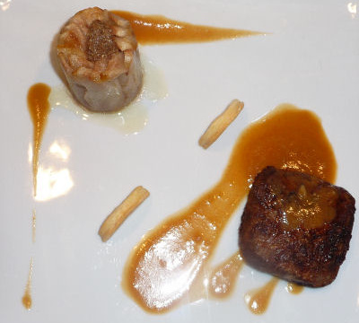 Il s'agit d'une crépinette de canard accompagnée d'un gâteau aux poires légèrement revenues et garni d'une mélange roquefort/pâte de noix, le tout servi avec une réduction de fond de veau au paprika doux liée à la poire