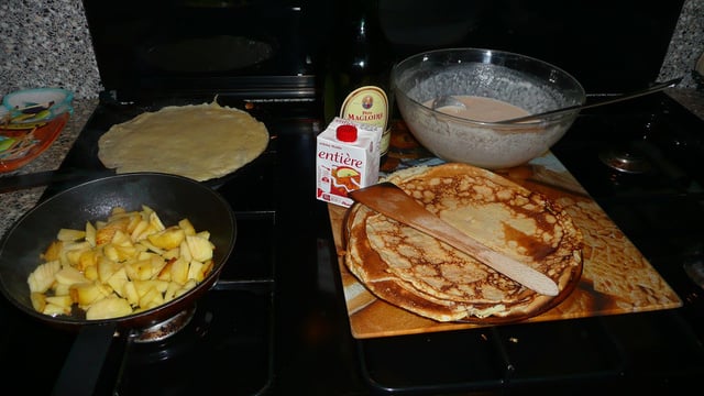 - 2Pendant le temps de cuisson éplucher les pommes, les laver et les couper en petits morceaux puis les cuire dans un poêlon avec un morceau de beurre, déglacer avec le calvados, flamber, ajouter la crème fraîche et laisser mijoter, remplir les crêpes, soit les rouler, soit les présenter en forme d'aumônière, servir chaud et régalez vous.